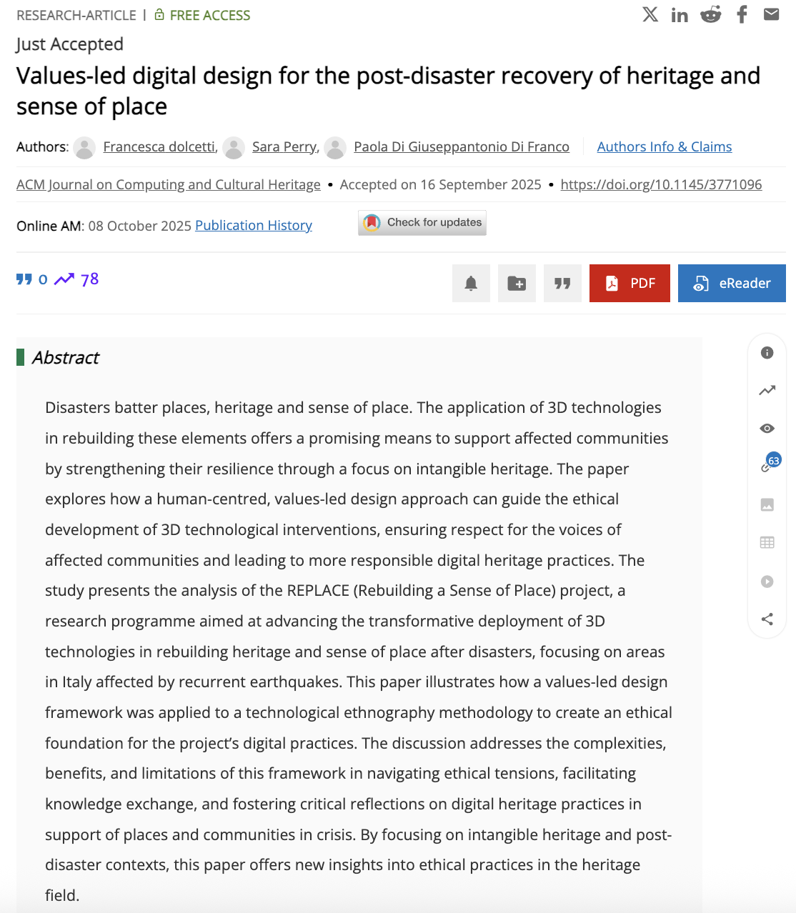 Disasters batter places, heritage and sense of place. The application of 3D technologies in rebuilding these elements offers a promising means to support affected communities by strengthening their resilience through a focus on intangible heritage. The article explores how a human-centred, values-led design approach can guide the ethical development of 3D technological interventions, ensuring respect for the voices of affected communities and leading to more responsible digital heritage practices.
